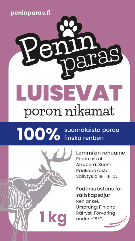 Kotimaisia poron nilkkoja. Erityisesti pienille ja keskikokoisille koirille sopivia herkkuluita.